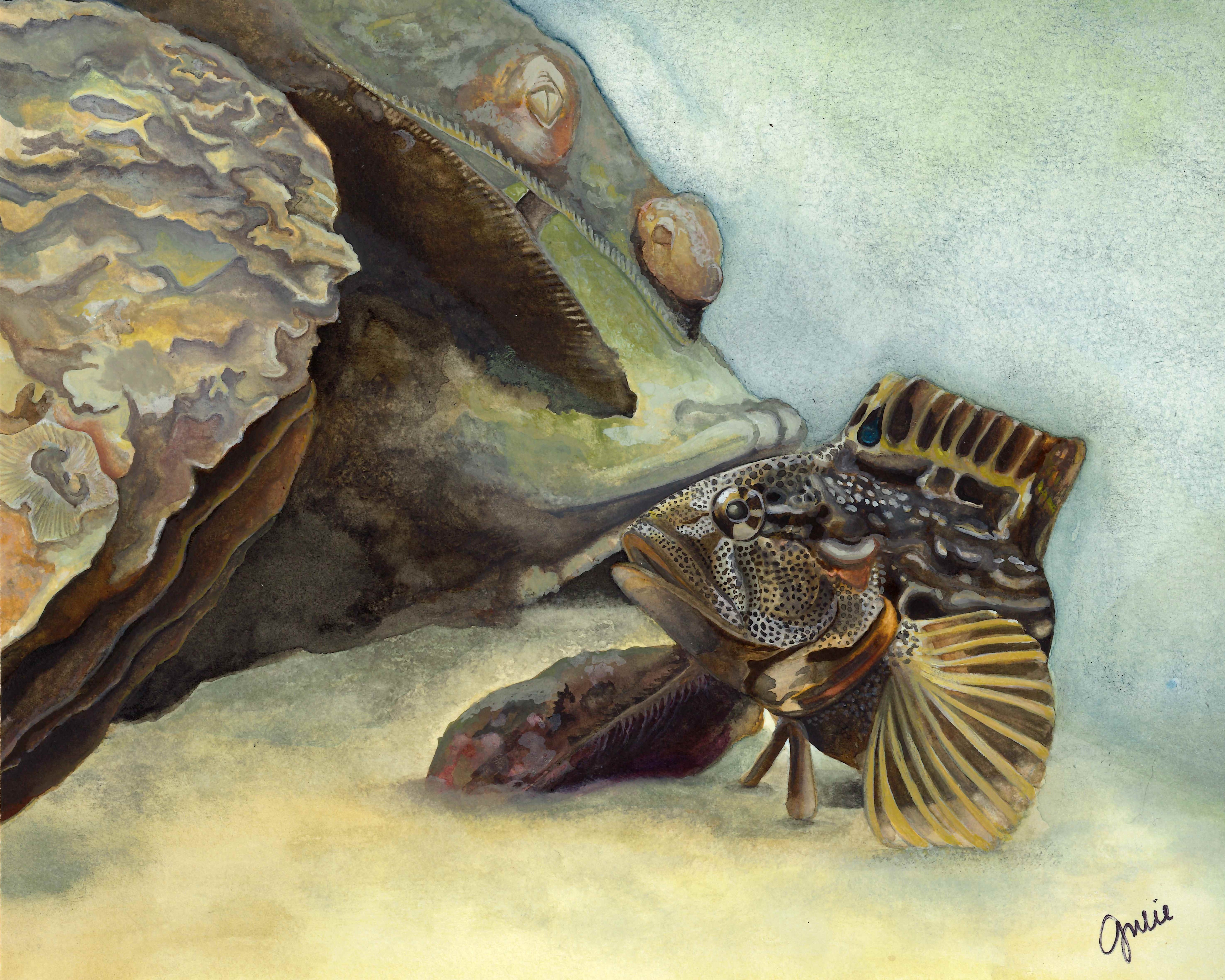 When spring waters warm and days grow longer, male Striped Blennies rouse from their slow-winter pace to become devoted suitors and fathers. When courting a female, the male Striped Blenny shakes his head and body with an outstretched dorsal fin, flashing his new breeding colors. Unlike fish that invest in producing thousands of small eggs, Stripped Blennies invest in producing fewer (100s) but larger eggs, which are deposited in neat adhesive clusters on the ceiling of the male’s chosen oyster shell. The males then become dedicated guardians, protecting the eggs from predators and gently fanning them to prevent silt accumulation. The male maintains this vigilant watch until the eggs hatch, never straying far from his shell nursery. He’ll continue tending new broods from spring through fall, a successful strategy that has enabled the Striped Blenny to persist and thrive within the complex oyster reef ecosystem.