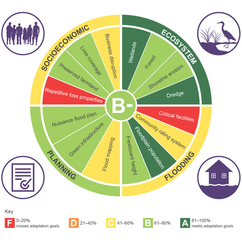 The ecosystem and planning categories score an A and a B+, respectively. Particular success has been seen in maintaining wetland acreage and in using dredge materials for restoration. Floodplain populations have also been reduced, decreasing the potential threat of coastal emergencies. Continued effort is still required to improve certain indicators, such as integrating and updating data and flood risk visualizations, including maps, as climate projections change.