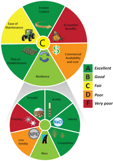 We focused on six evaluation criteria for each species of turfgrass and performed an extensive literature review of over 500 journal articles, white papers reports, fact sheets, and detailed discusstions with turfgrass experts.   We first considered 104 commercially available grass species and then used a trait-based approach to select a subset of species for evaluation.