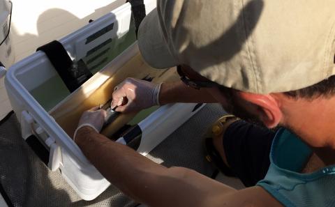 The operating table on which O’Brien works is a cooler filled with a mix of ocean water and a solution that temporarily anesthetizes the fish. He sets a fish one at a time on a halved PVC pipe lined with foam that balances on Velcro straps wrapped around the cooler. Then he makes an incision to place the small transmitter.